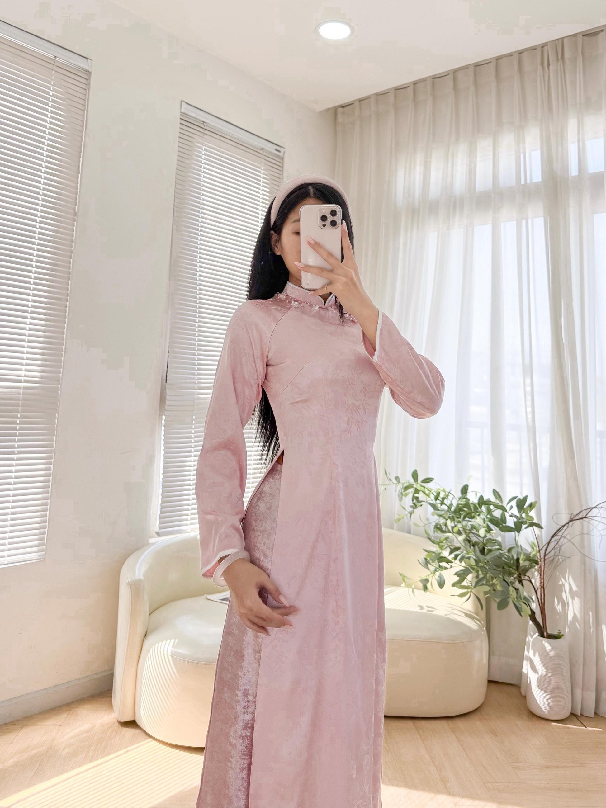 Our silk is highly selected with embossed flower patterns, giving it a unique shine from a distance and a delicate look at close sight. If you are a big fan of 3D ao dai but was not satisfied with normal materials on the market, this will be your perfect choice