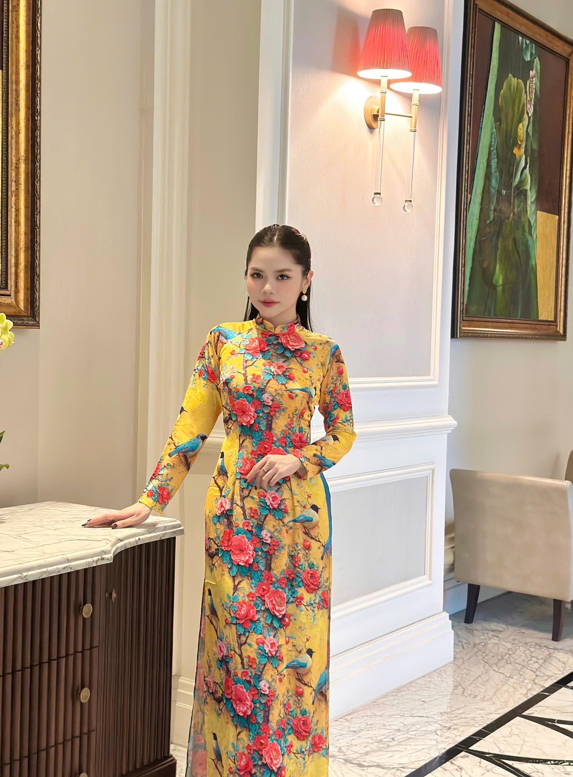 Traditional pure silk Ao dai with pring bird and rose print- Ao dai truyen thong - Vietnamese traditional dress for women