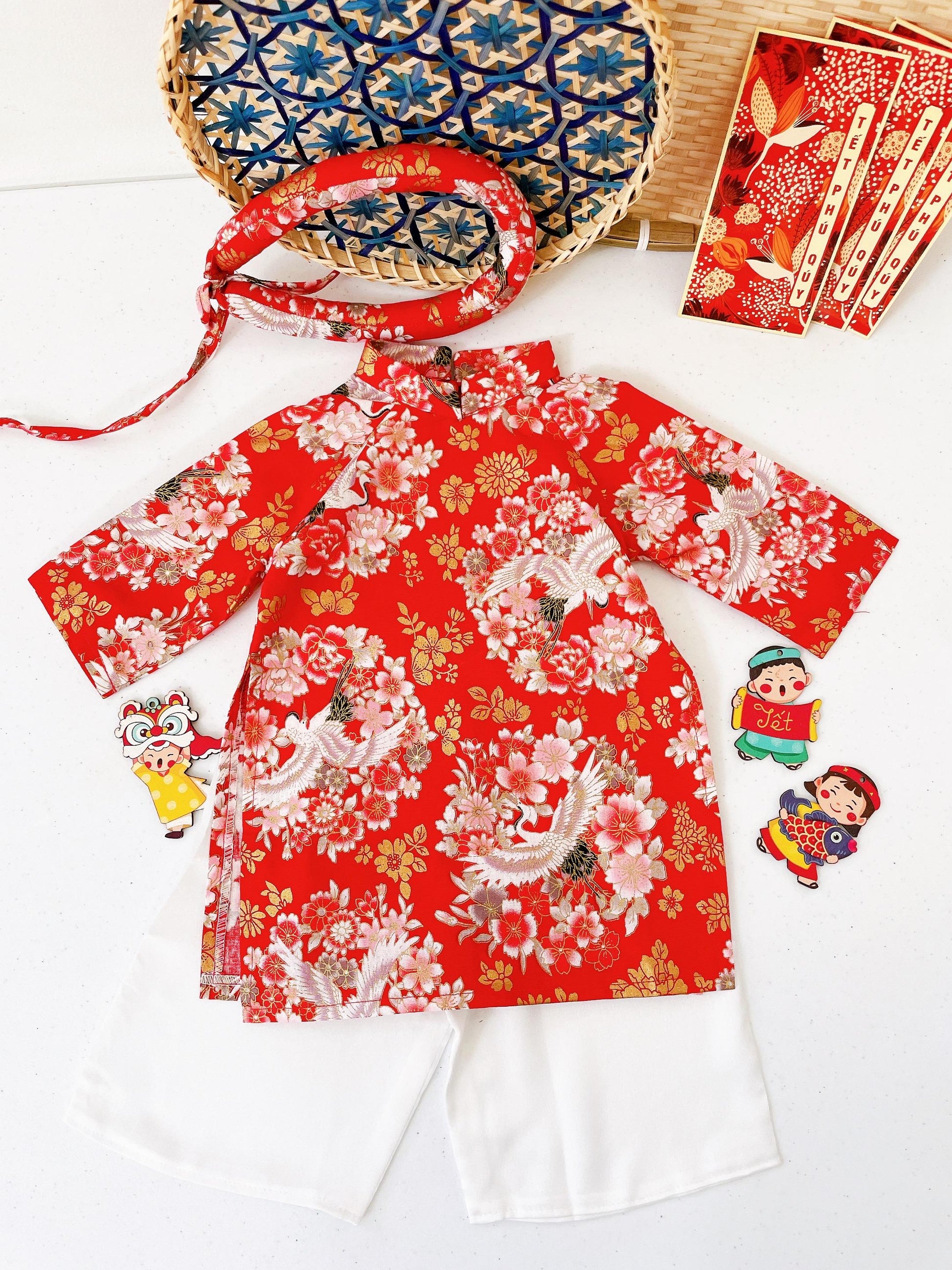 Made from linen, the fabric is breathable and safe for baby’s sensitive skin. The pattern was inspired by Japanese kimono. It will be the best first áo dài for your little one