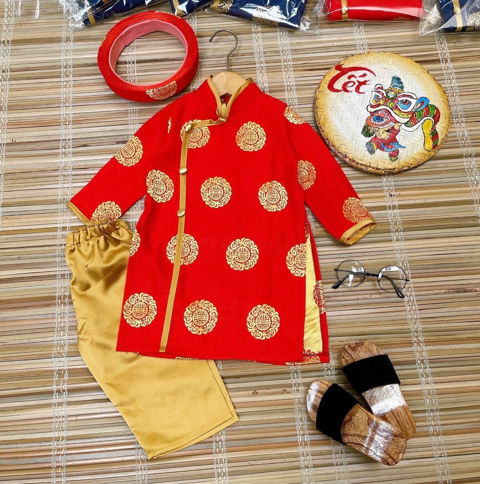 Due to the fabric availability, our new stock for red ao dai will have smaller Sì pattern (as shown on the boy model)