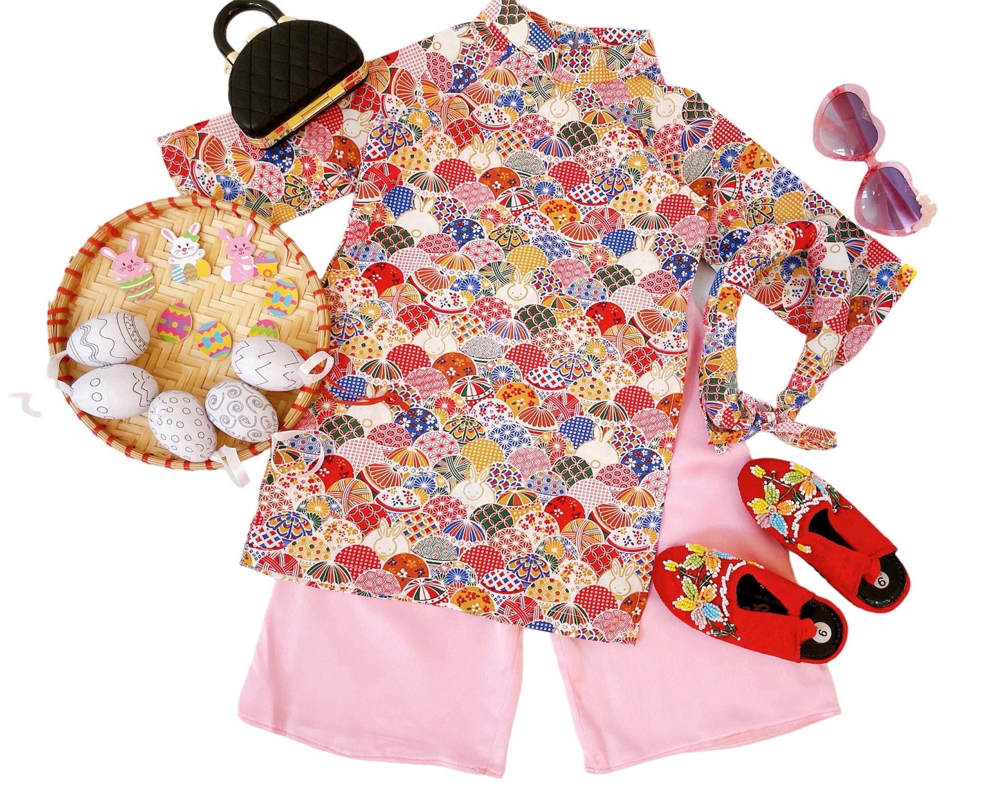 Made from linen, the fabric is breathable and safe for baby’s sensitive skin. The pattern was inspired by Japanese kimono. It will be the best first áo dài for your little one